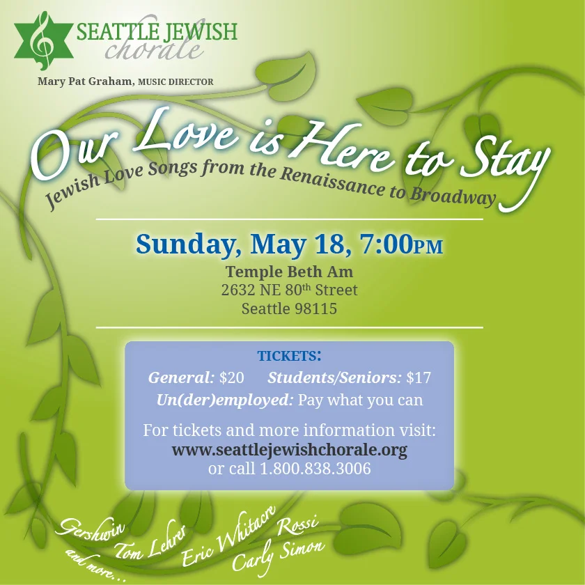Seattle Jewish Chorale celebrates spring with songs of love in their Season Finale Concert on Sunday, May 18th at 7pm, in the beautiful sanctuary of Temple Beth Am, 2632 NE 80th St., Seattle.